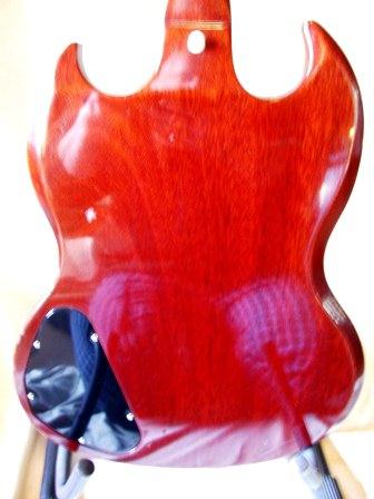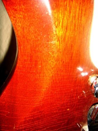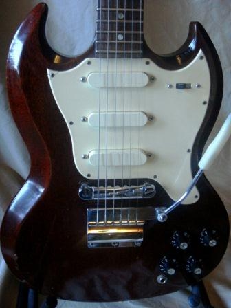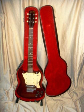 All Original. Walnut-stained, all mahogany, condition 8.5 out of 10. No breaks; excellent like-new re-fret, but with rounded Fender-ish frets, rather than flatish- Gibson type frets; some finish chipping. For the Gibson lover that prefers a Stratocaster feel. Pickup covers and pickguard nicely yellowed. Original three-way slide switch touchy as usual. Vibrato works perfect and stays in tune. OHSC included - really good condition, but not a hardshell case by today's standards.